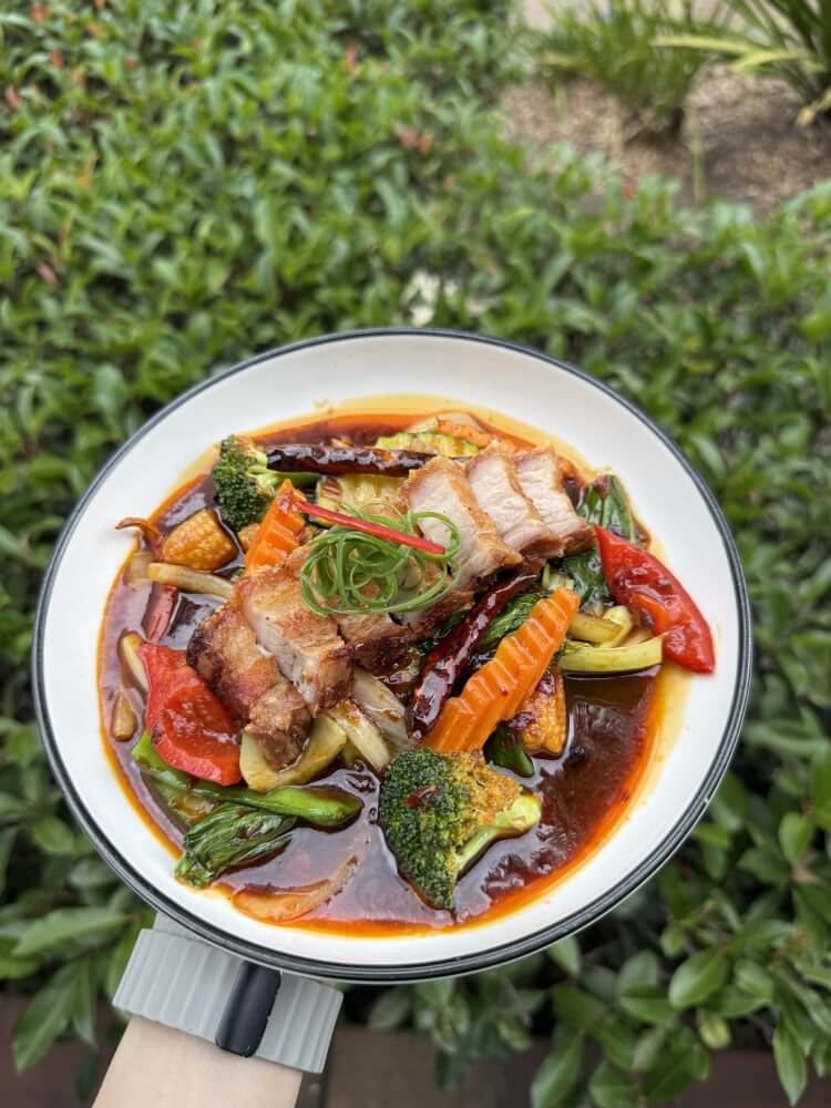 Stir-fried crispy pork belly with chilli jam sauce, garlic, onion and mixed vegetables